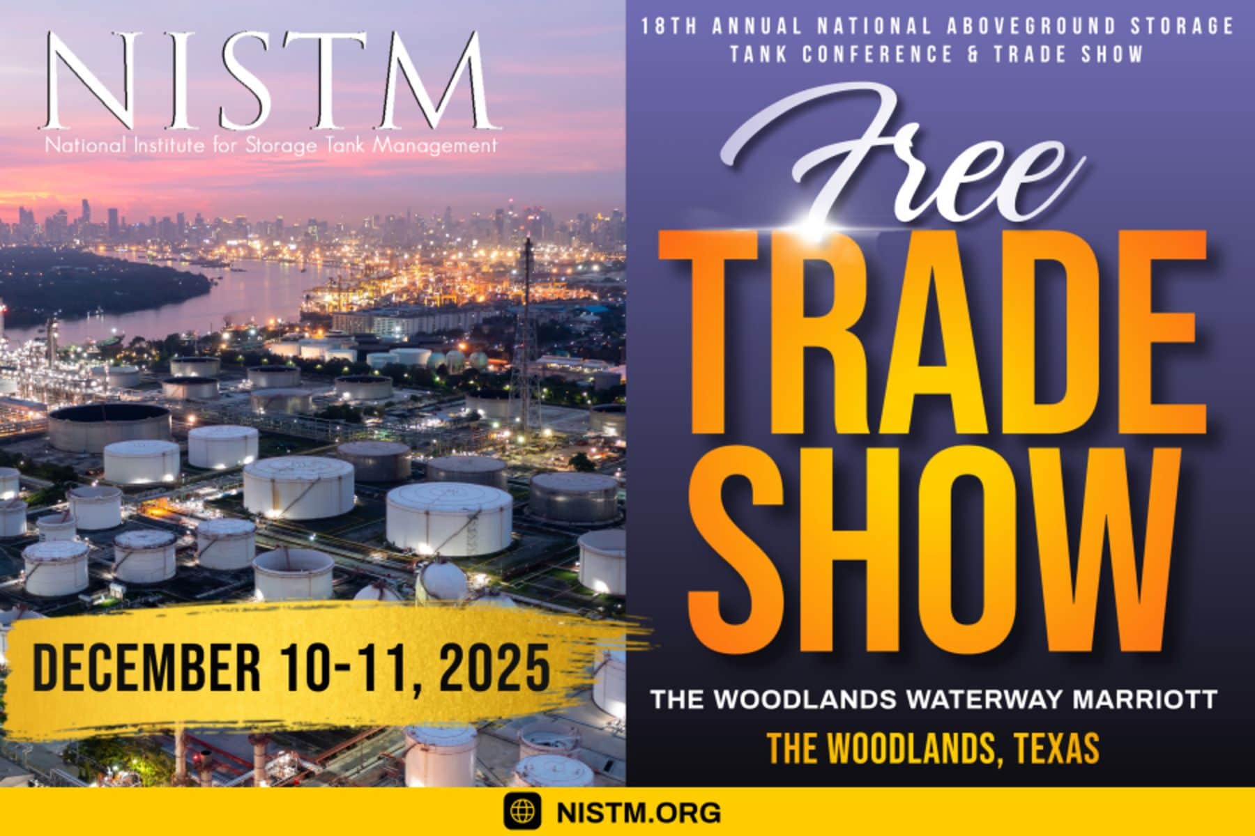 Register Now for the 18th Annual National Aboveground Storage Tank Conference & Trade Show Co-Located Courses- December 9, 2025 – The Woodlands, Texas