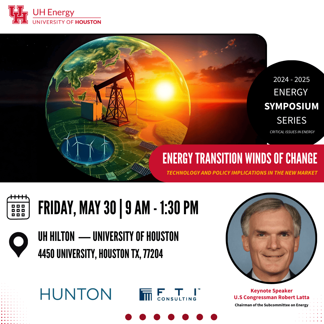 Join us on Friday, May 30, from 9:00 AM to 1:30 PM at the UH Hilton for the next event in the University of Houston’s Energy Symposium Series. This year’s topic, “Energy Transition Winds of Change: Technology and Policy Implications in the New Market,” dives into how new innovation is transforming the energy sector.